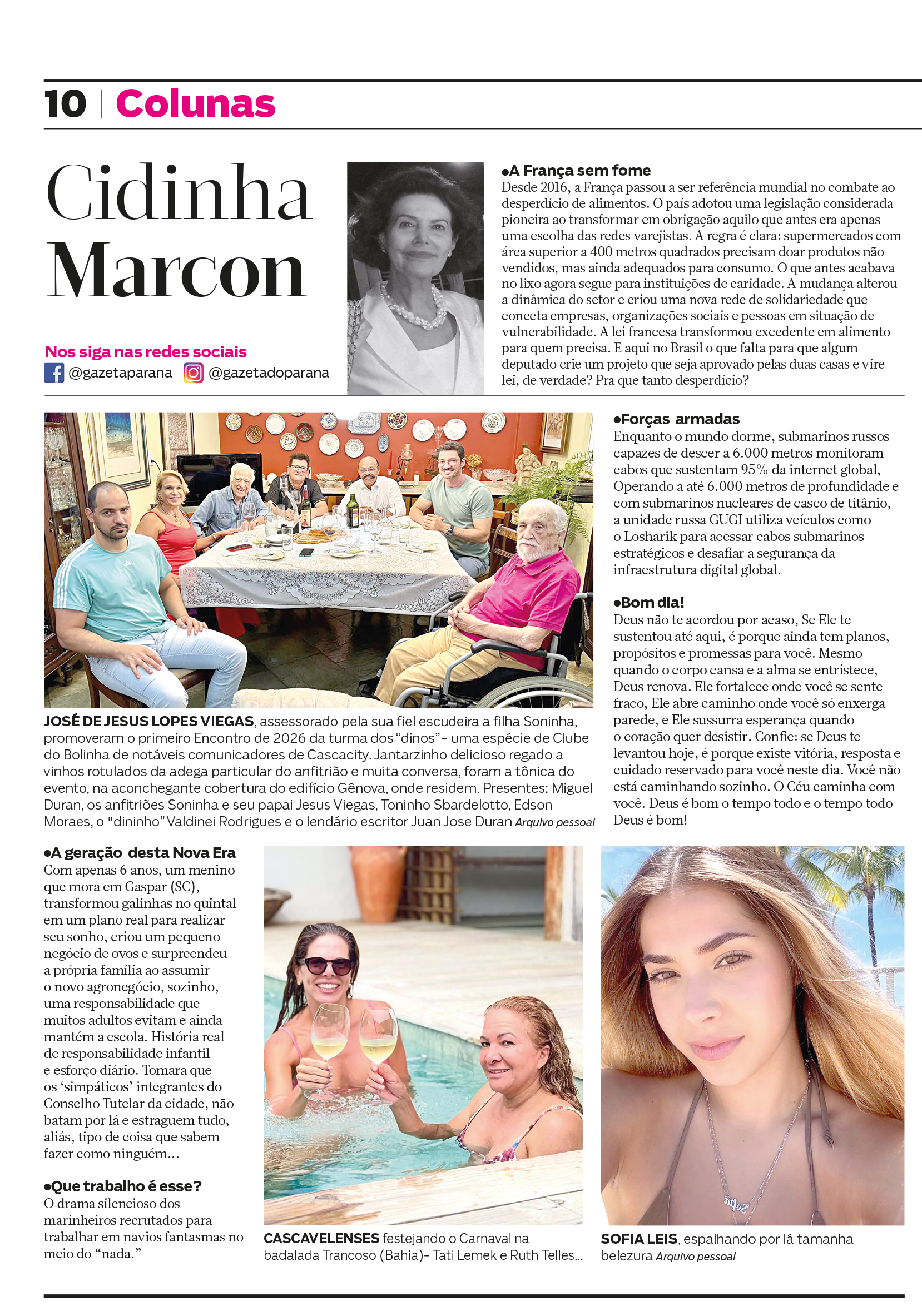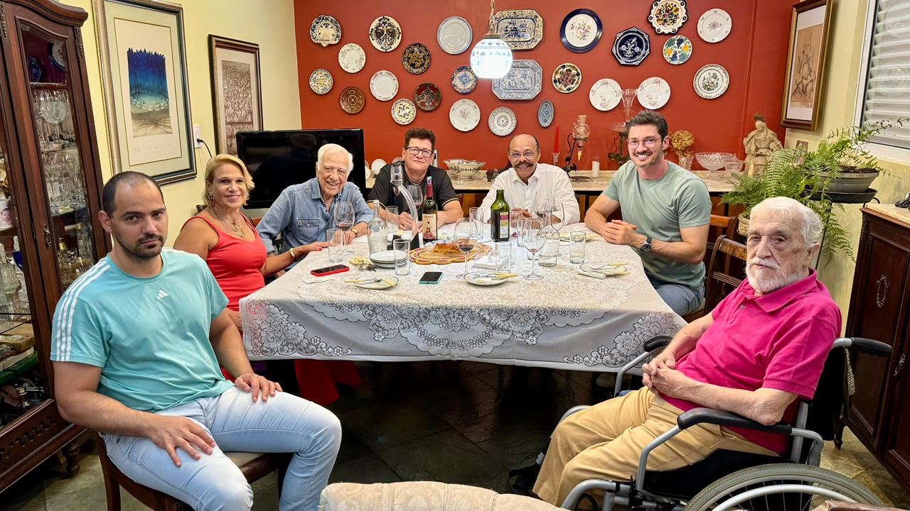 José de Jesus Lopes Viegas, assessorado pela sua fiel escudeira a filha Soninha, promoveram o primeiro Encontro de 2026 da turma dos “dinos” - uma espécie de Clube do Bolinha de notáveis comunicadores de Cascacity. Jantarzinho delicioso regado a vinhos rotulados da adega particular do anfitrião e muita conversa, foram a tônica do evento, na aconchegante cobertura do edifício Gênova, onde residem. Presentes: Miguel Duran, os anfitriões Soninha e seu papai Jesus Viegas, Toninho Sbardelotto, Edson Moraes, o "dininho” Valdinei Rodrigues e o lendário escritor Juan Jose Duran. Arquivo pessoal