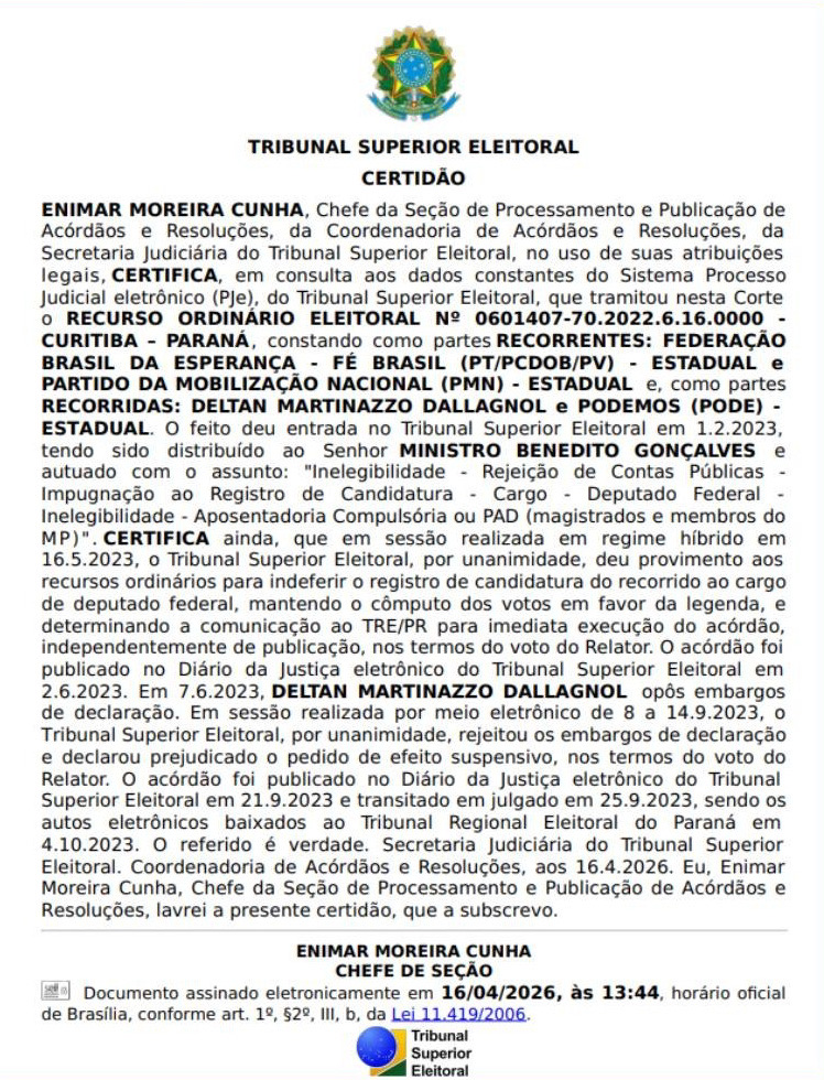 Assinada pela Secretaria Judiciária do TSE, a certidão detalha o trâmite do Recurso Ordinário Eleitoral nº 0601407-70.2022.6.16.0000, que teve como relator o ministro Benedito Gonçalves. Em sessão realizada em 16 de maio de 2023, o plenário decidiu, por unanimidade, dar provimento aos recursos e indeferir o registro de candidatura de Dallagnol ao cargo de deputado federal. A decisão teve execução imediata e foi posteriormente mantida após a rejeição de embargos de declaração.