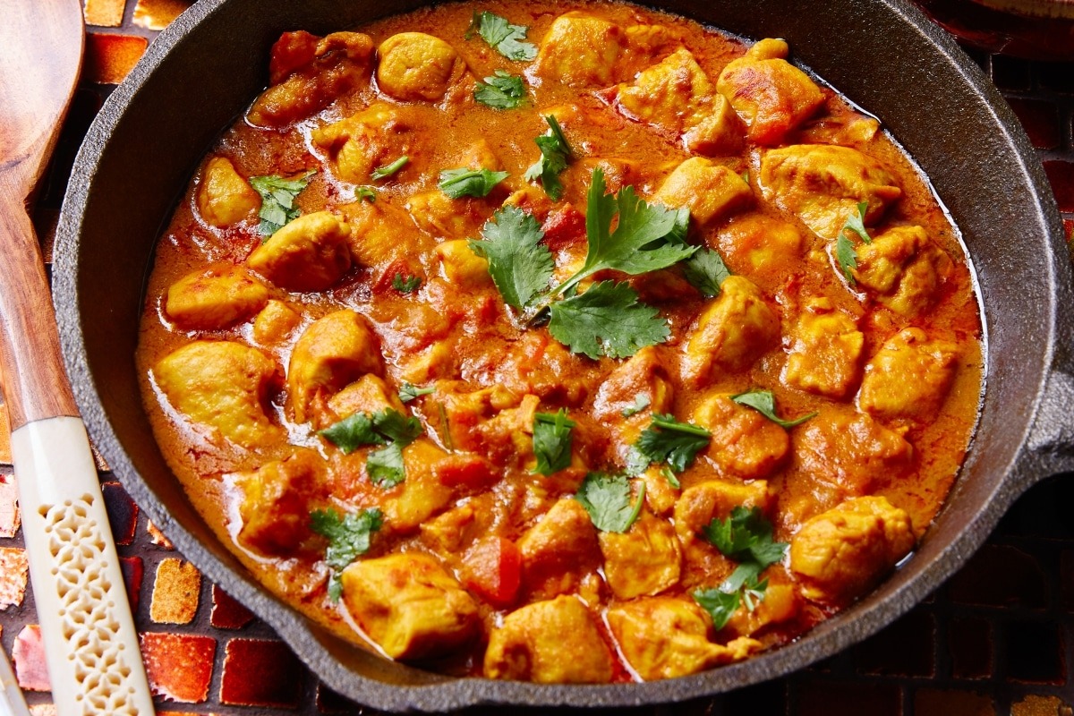 Chicken Tikka Masala: cubos de frango assados no espeto (tikka) e envolvidos em um molho masala rico e picante.