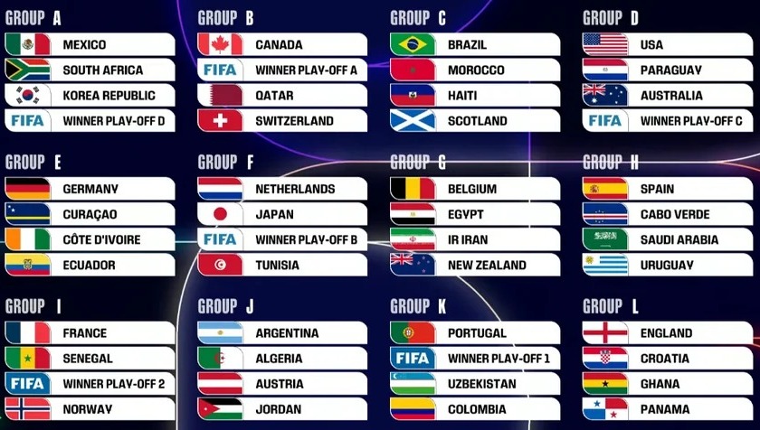 •Grupo K: Portugal, Colômbia, Uzbequistão e vencedor da repescagem (República Democrática do Congo, Jamaica ou Nova Caledônia)