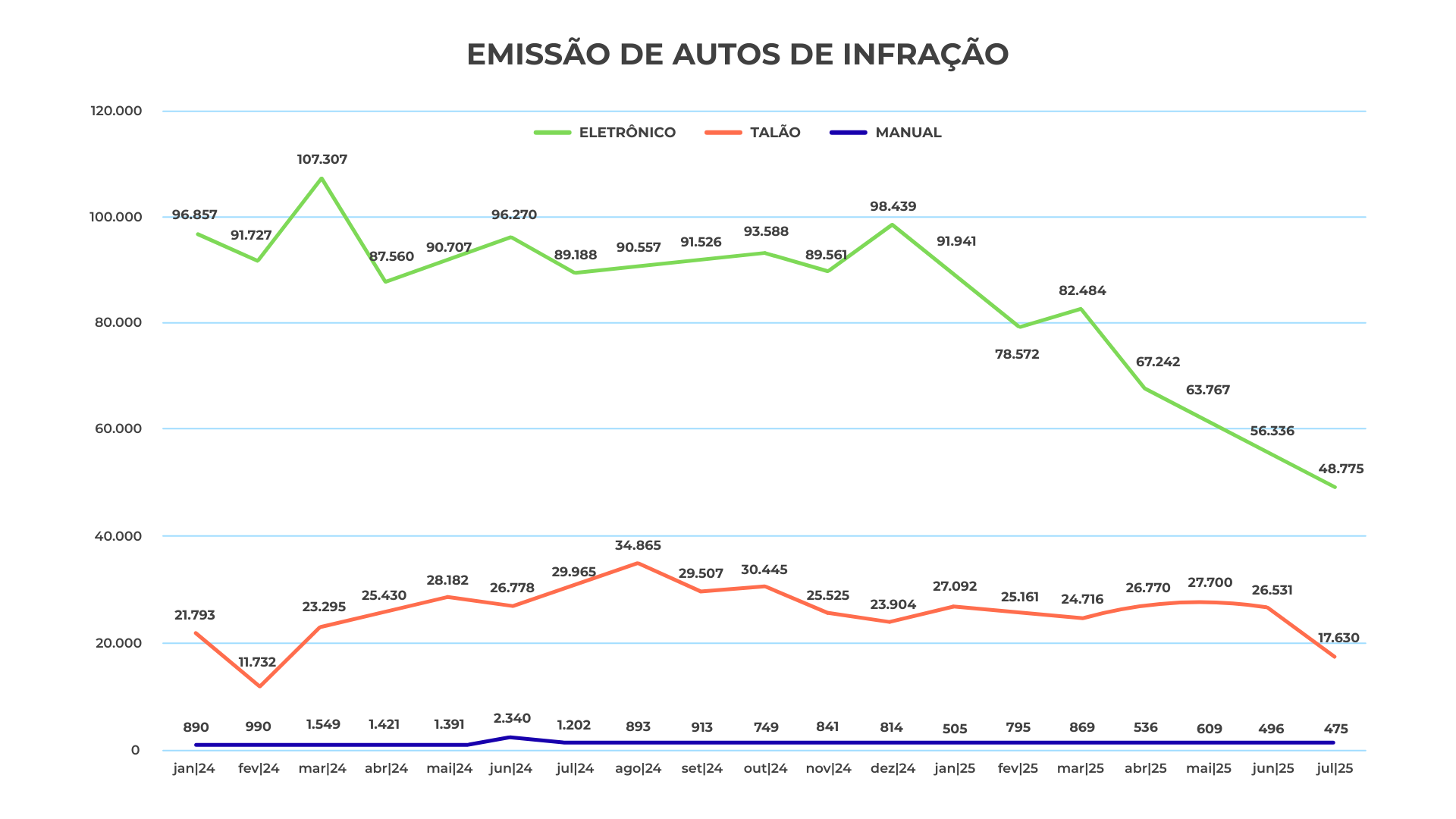 No período de janeiro a julho de 2025 houve o registro de 489.117 infrações, e no mesmo intervalo do ano passado, o número de notificações emitidas por radares foi de 659.616 em Curitiba.