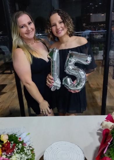 As toledanas- Beatriz Henz comemorando os 15 anos da filha Emilly, sábado (dia 01). Foto: arquivo pessoal.