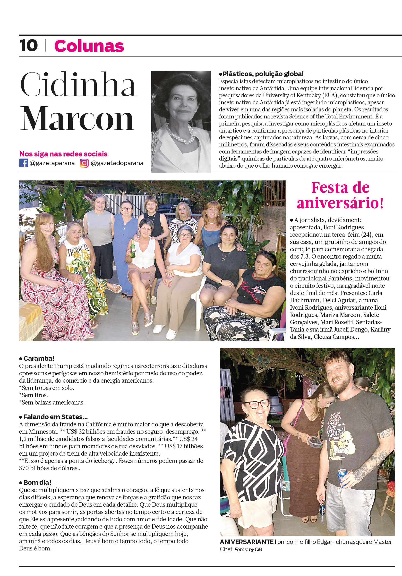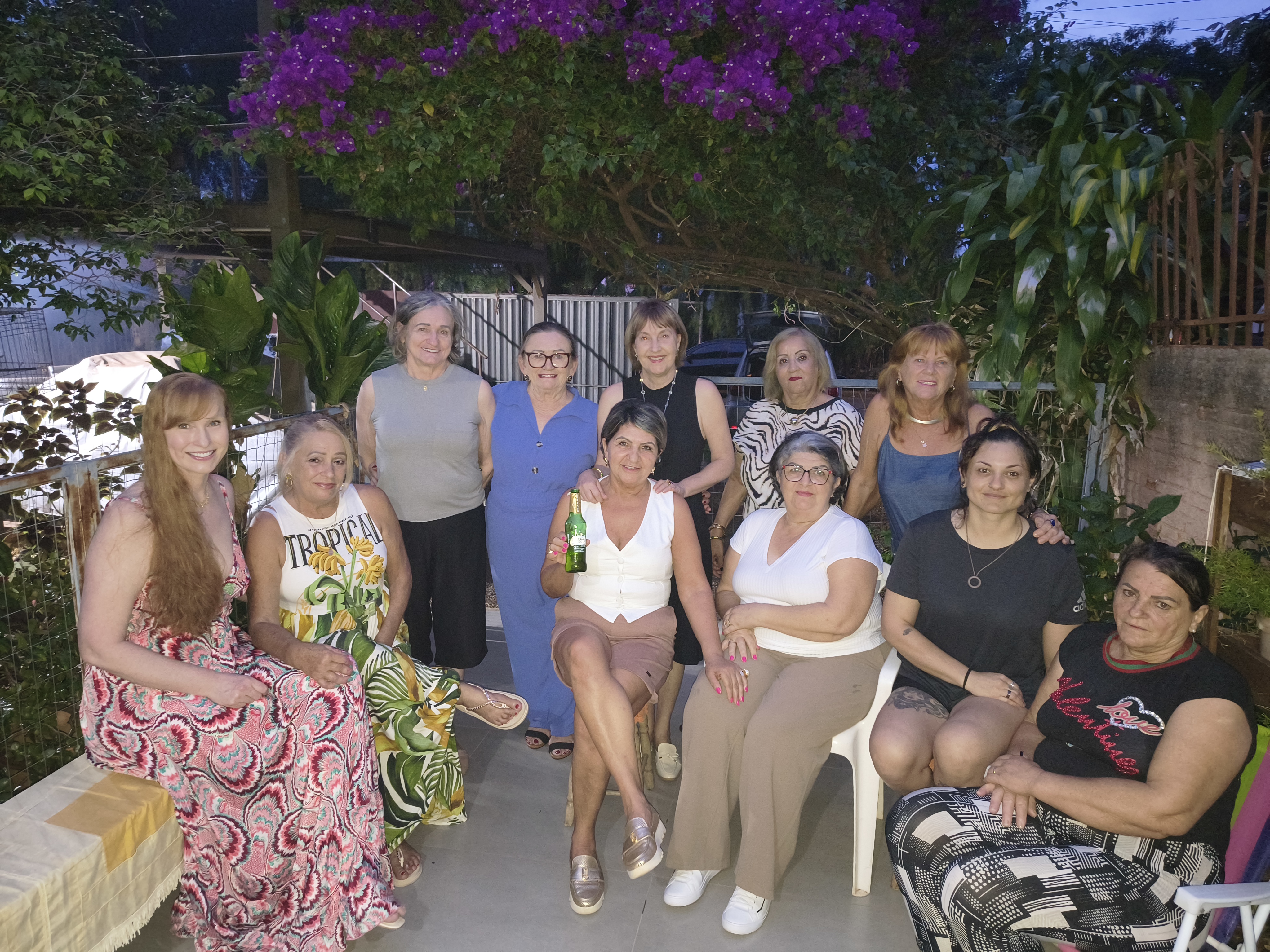 A jornalista, devidamente aposentada, Iloni Rodrigues recepcionou na terça-feira (24), em sua casa, um grupinho de amigos do coração para comemorar a chegada dos 7.3. O encontro regado a muita cervejinha gelada, jantar com churrasquinho no capricho e bolinho do tradicional Parabéns, movimentou o circuito festivo, na agradável noite deste final de mês. Presentes: Carla Hachmann, Delci Aguiar, a mana Ivoni Rodrigues, aniversariante Iloni Rodrigues, Mariza Marcon, Salete Gonçalves, Mari Rozetti. Sentadas- Tania e sua irmã Juceli Dengo, Karliny da Silva...
