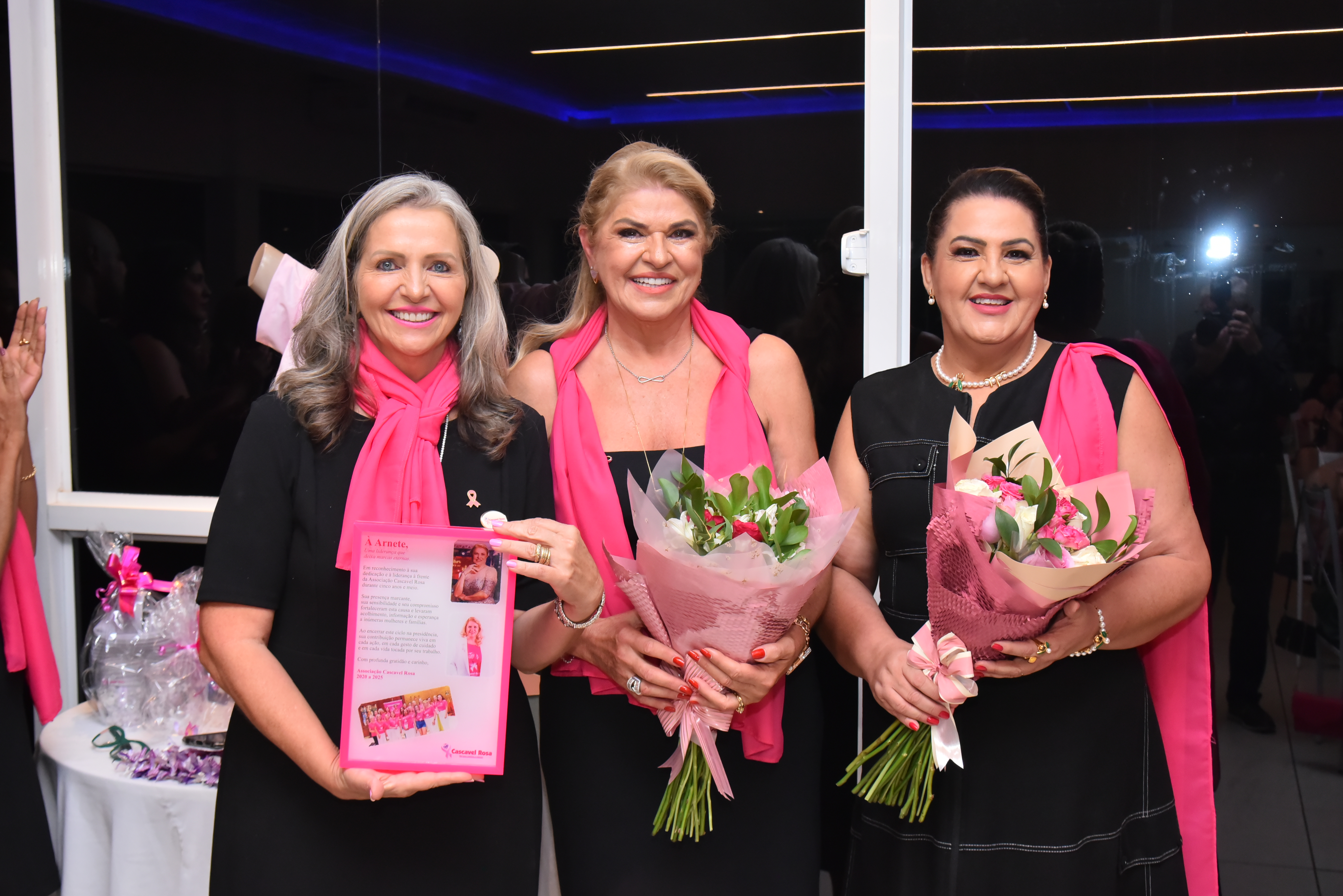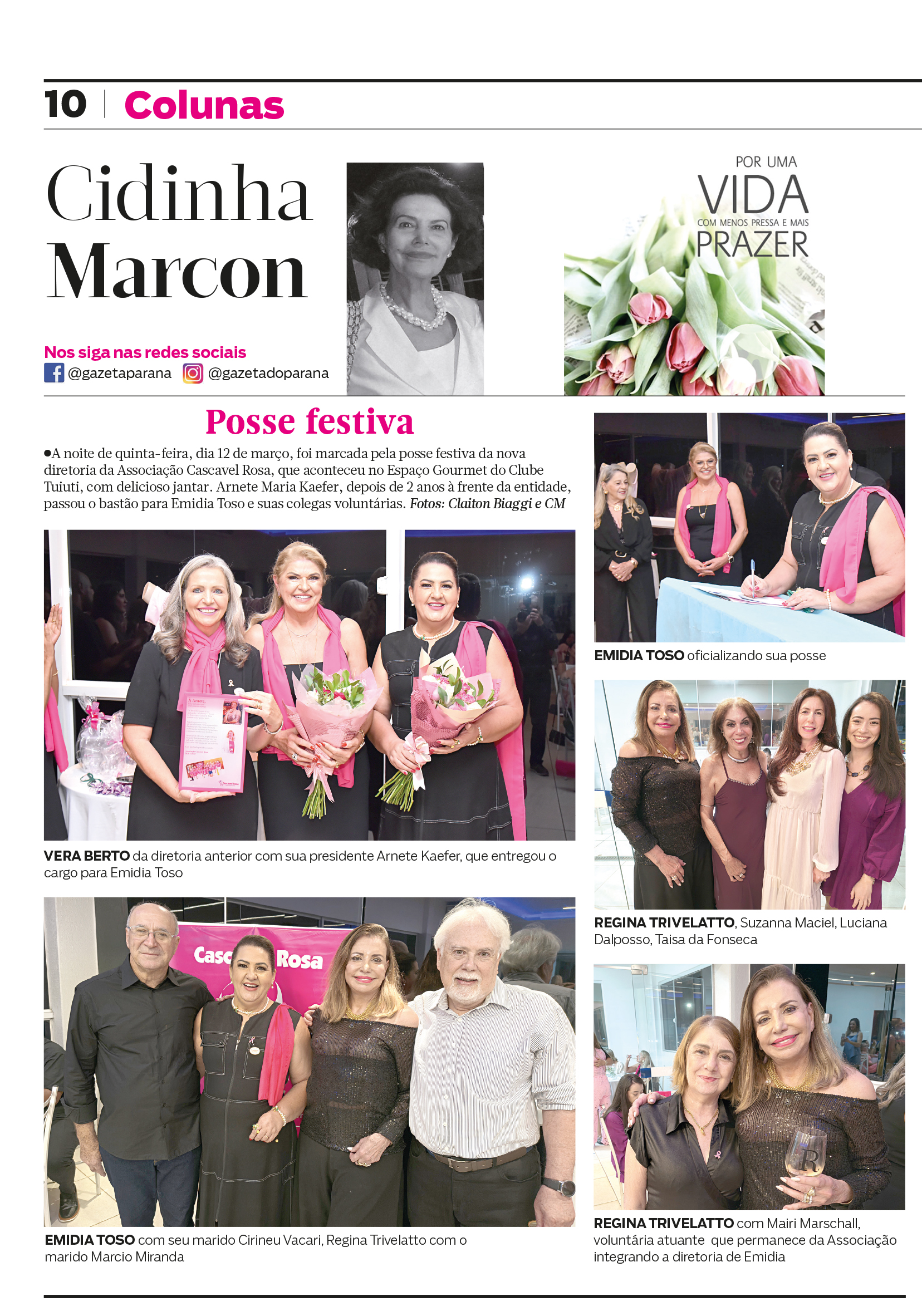 A noite de quinta-feira, dia 12 de março, foi marcada pela posse festiva da nova diretoria da Associação Cascavel Rosa, que aconteceu no Espaço Gourmet do Clube Tuiuti, com delicioso jantar. Arnete Maria Kaefer, depois de 2 anos à frente da entidade, passou o bastão para Emidia Toso e suas colegas voluntárias. Fotos: Claiton Biaggi e CM