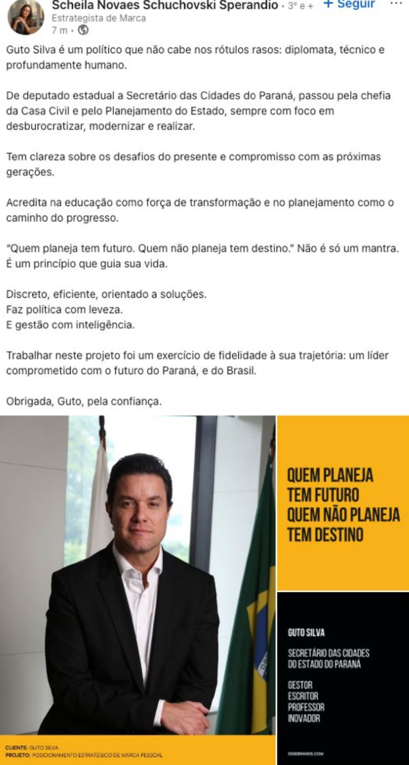 Quando Scheila Novaes Schuchovski Sperandio apresentou publicamente o trabalho realizado para Guto Silva, deixou claro que não se tratava de comunicação institucional nem de assessoria pontual. Em publicação no LinkedIn, a publicitária descreveu o projeto como um exercício de posicionamento estratégico de marca pessoal, voltado à construção de identidade, narrativa e imagem pública do secretário estadual das Cidades. O vínculo foi assumido sem ressalvas: Guto era o cliente. Além disso, Scheila divulga trabalhos realizados para a esposa do secretário, Karina Amadori.