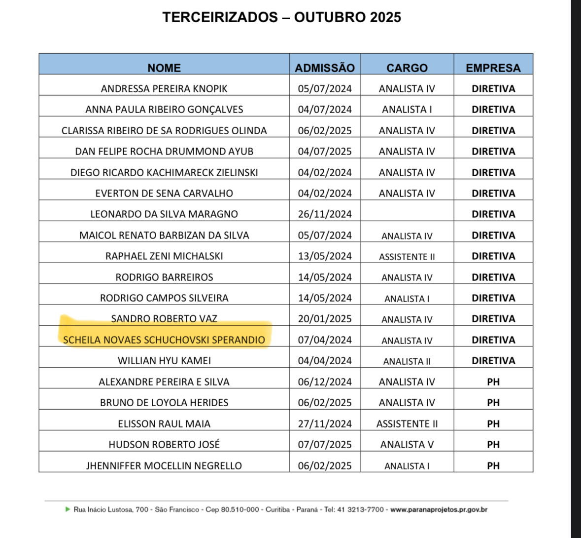 Enquanto desenvolvia esse trabalho de branding político, Scheila já integrava, desde abril de 2024, o quadro de profissionais terceirizados da Paraná Projetos, órgão estratégico vinculado ao Governo do Paraná. Nos registros oficiais da entidade, ela aparece nominalmente como Analista IV, um dos cargos técnicos de maior nível previstos no contrato de terceirização firmado com a empresa Diretiva Patrimonial Ltda.
