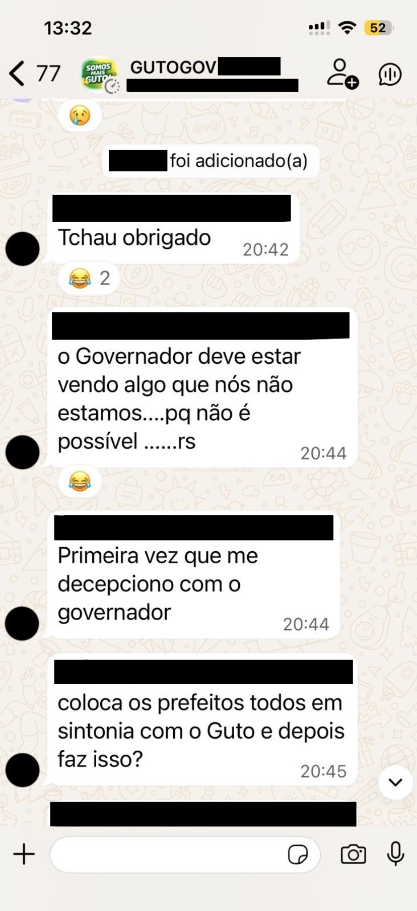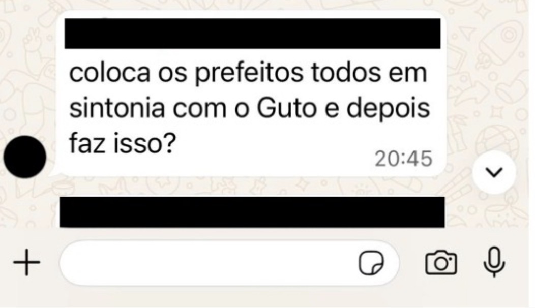 Nas conversas, o tom é de perplexidade. Um dos participantes questiona diretamente a coerência da articulação política: “coloca os prefeitos todos em sintonia com o Guto e depois faz isso?”. A frase sintetiza o sentimento predominante no grupo, que aponta descompasso entre o alinhamento construído com lideranças municipais e decisões recentes do núcleo do governo.