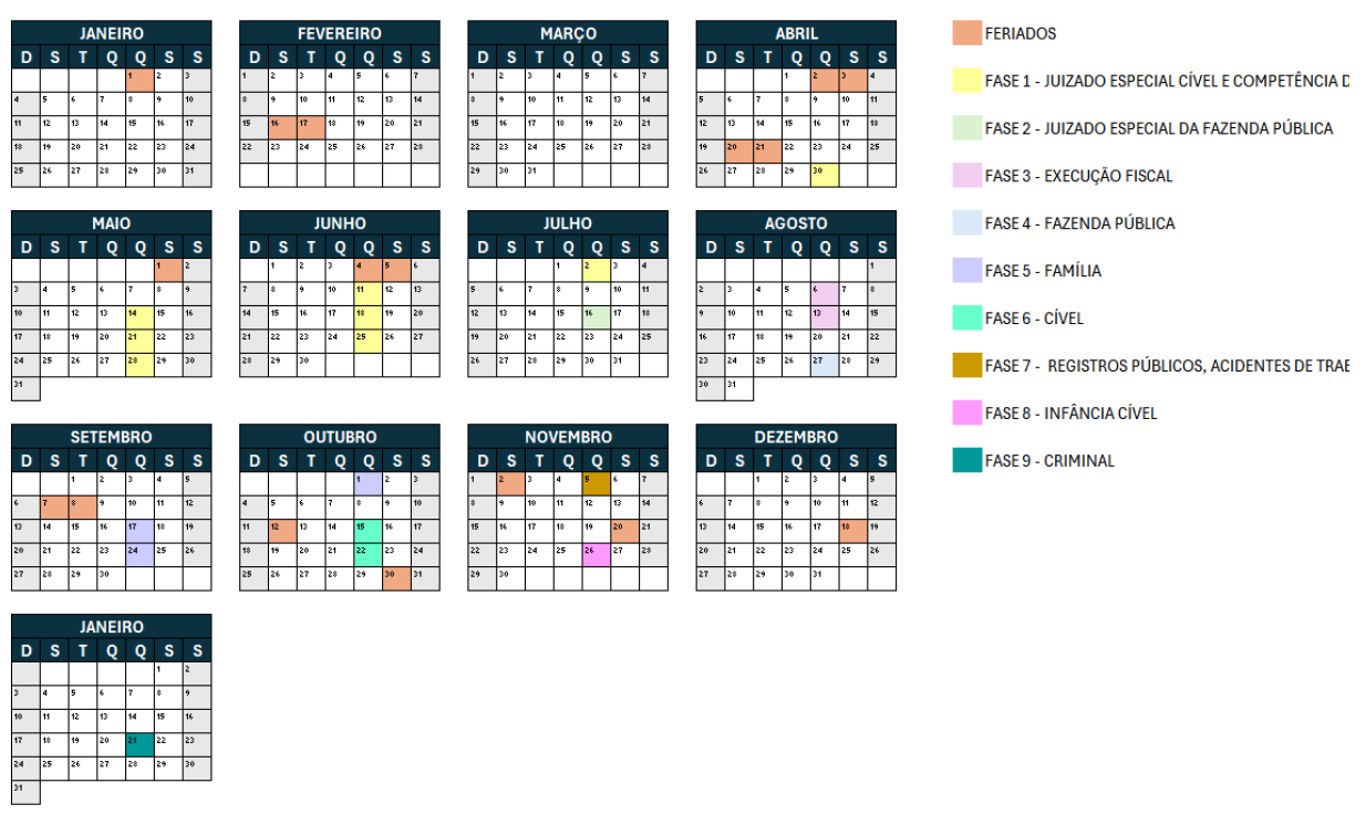 O calendário foi pensado em fases vinculadas a competências específicas e com sub etapas internas de implantação para aquelas que apresentam maior volume. Ao todo, são 9 fases distribuídas num período de 10 meses, que abarca o período de abril deste ano até janeiro de 2027. A ordem das fases levou em conta a complexidade para a implementação, que envolve desenvolvimentos específicos de TI, integrações e participação de instituições externas, além da atuação do segundo grau de jurisdição.